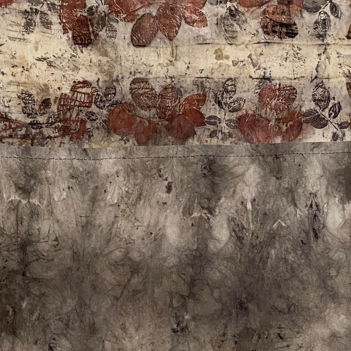 Many of the silk works are delicately patterned with layers of prints from the ecodying processes that Ruth uses, resonating with patterns seen in nature that she encounters during her walking practice.