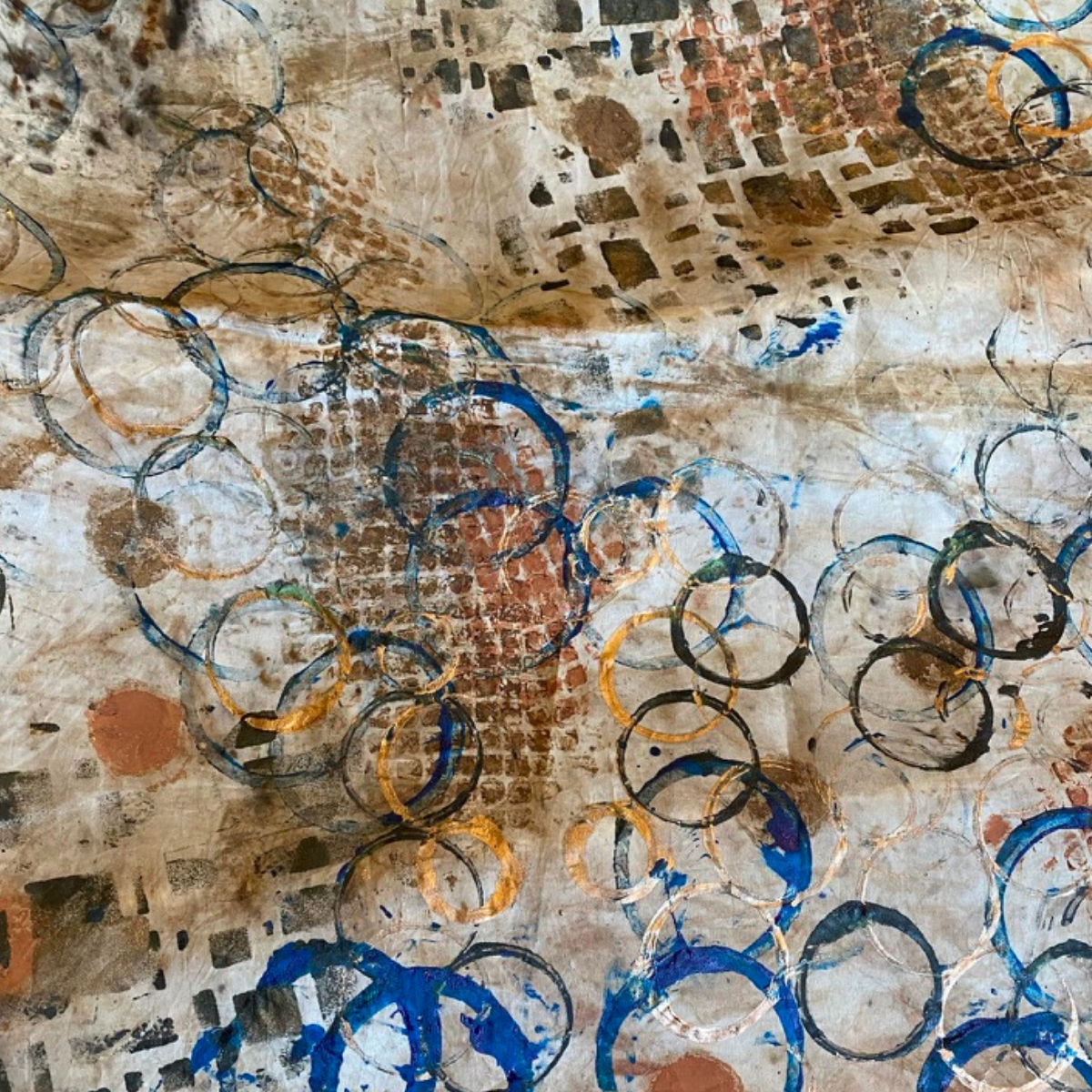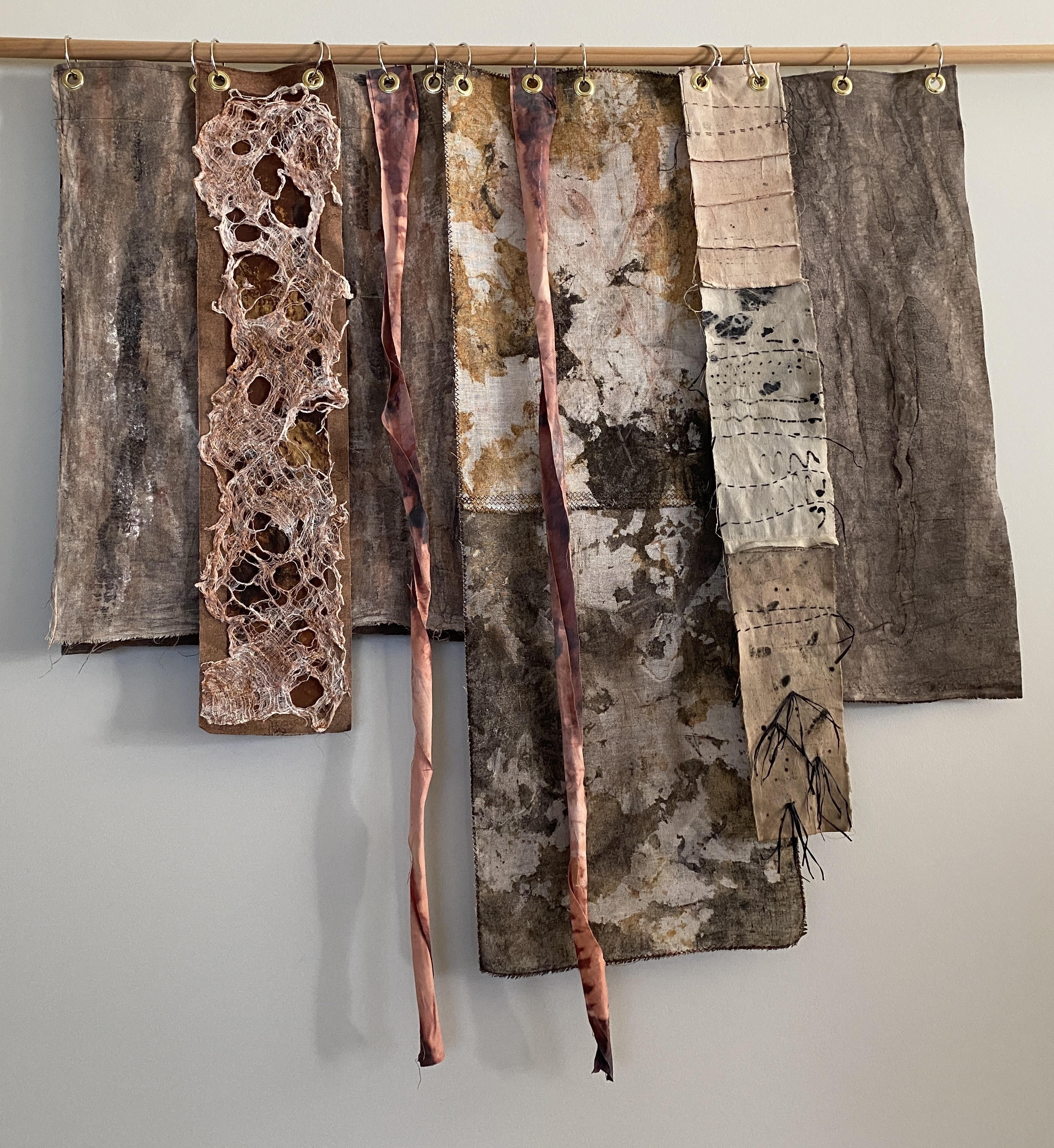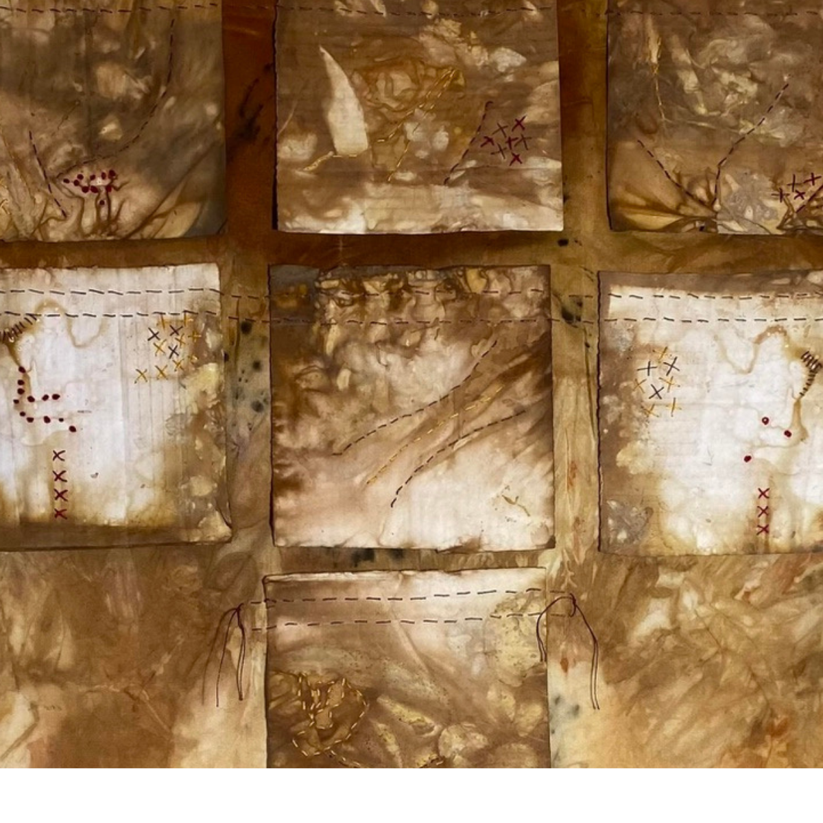 Ruth Nicholas uses eco dying, rusting and painting with earth pigments to bring ‘Earthwise’ to life. Painting on linen using earth pigments mixed with soya milk uses sustainable art materials and practices and the addition of stitch adds extra impact.