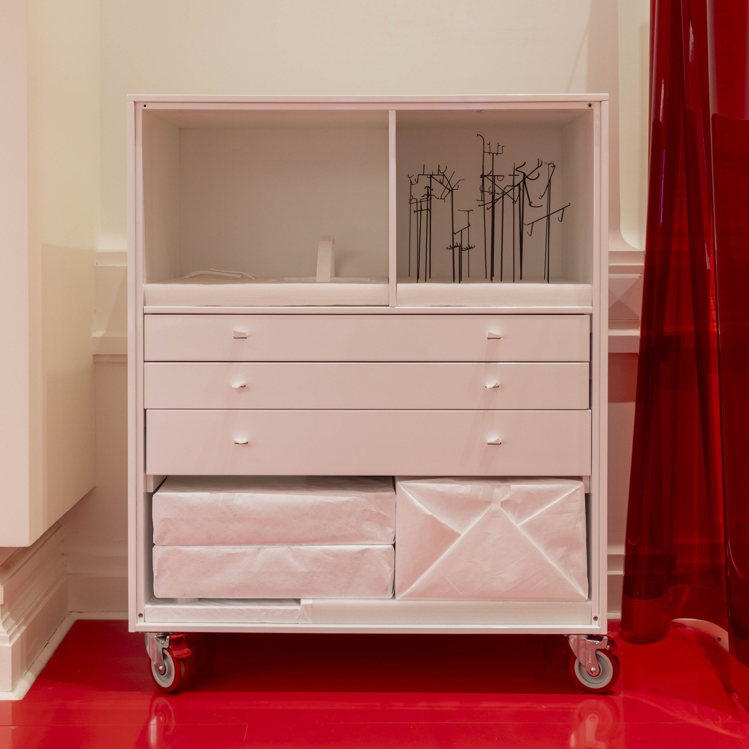 Three years in the making, Sophia Smolenski’s installation ‘Offering It Up’ uses the accoutrement of the mount-maker’s workshop and the furniture of exhibition display as a framing device for the presentation of 22 art works. The works featured are made by a range of contemporary Aotearoa New Zealand artists who were invited to create items for display in response to mounts first constructed for objects in Smolenski’s personal possession. This exhibition was first presented at Te Pātaka Toi Adam Art Gallery.