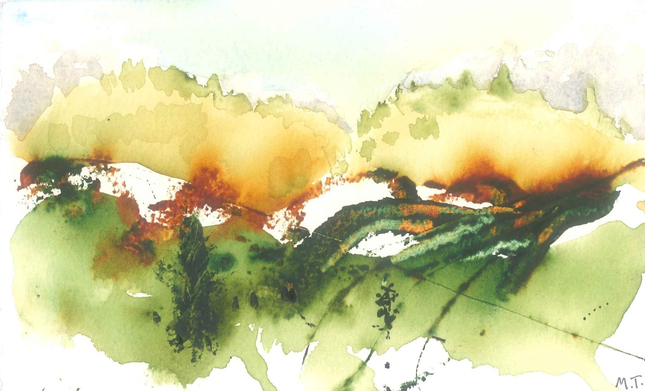 Small studies in watercolor, ink, and charcoal, created almost daily, accompanied by poetic reflections.