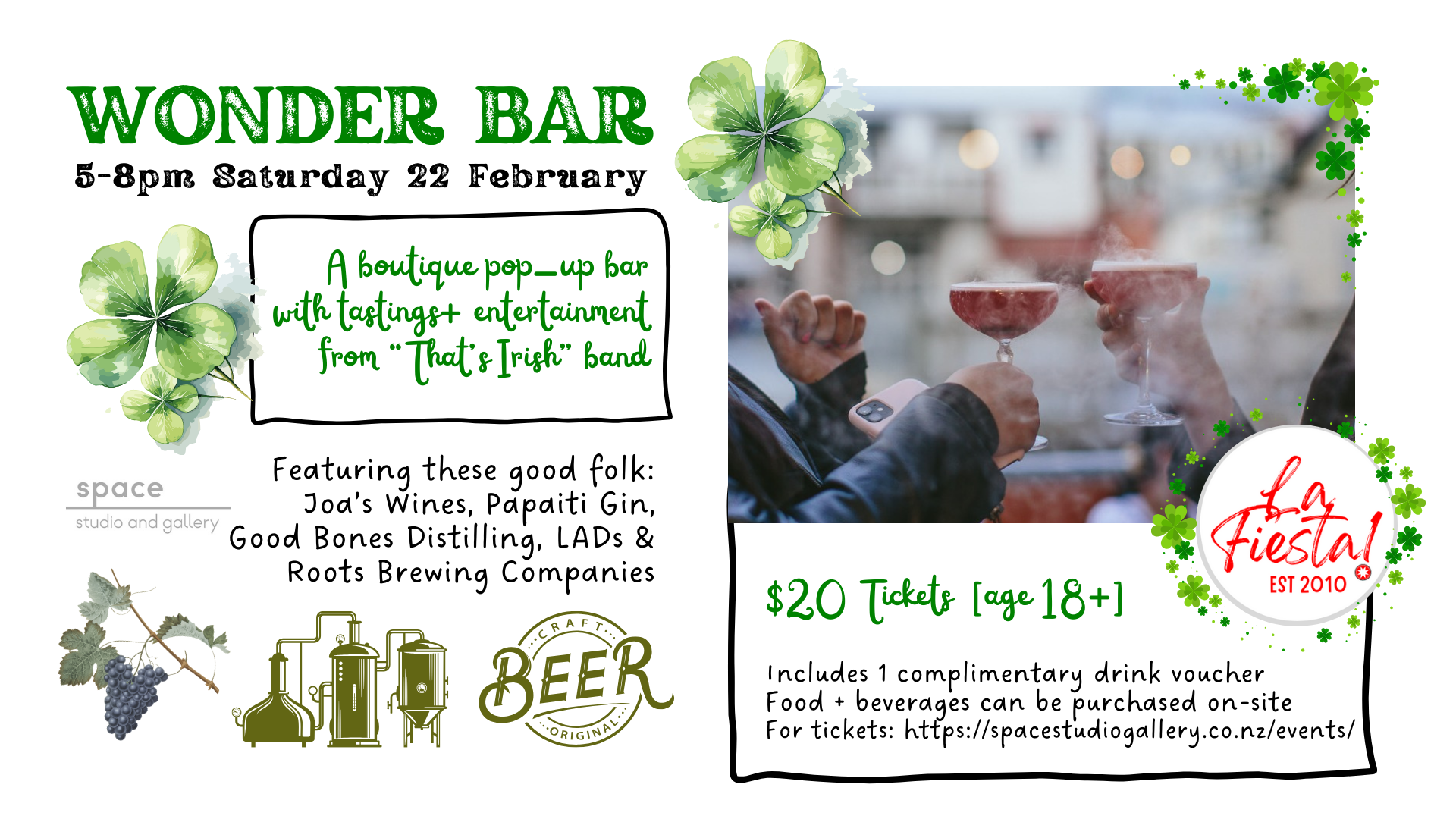 Come and enjoy this boutique pop-up bar within Space Studio & Gallery. With tastings from Joa’s Wines, Papaiti Gin, Good Bones Distilling, Roots & LADS Brewing Companies. Entertainment brought to you by ‘That’s Irish’ band with a food truck on-site aswell.